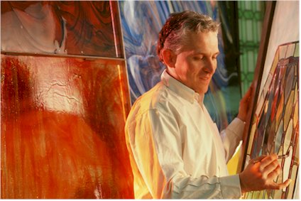 Le maître vitrailliste Luc-Benoît Brouard devant les multiples échantillons de verre de son atelier. © D.R.